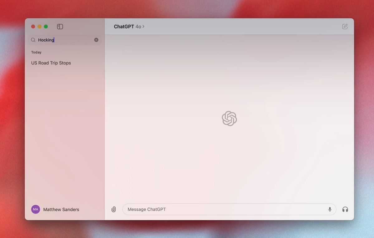 ويعمل تطبيق ChatGPT في نظام macOS بالنموذج الجديد GPT-4o، ويسمح للمستخدمين بإرسال استفسارات إلى روبوت الدردشة عبر الإدخال النصي أو الصوتي مثل الموقع الإلكتروني.