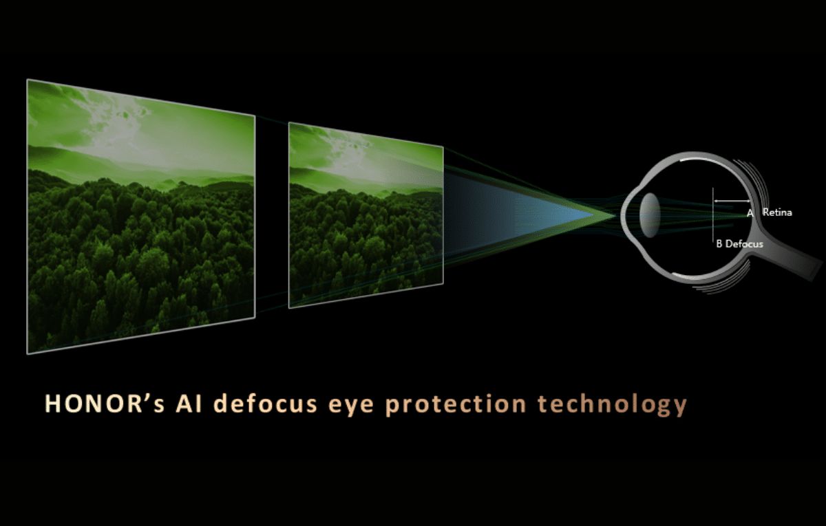 كشفت شركة هونر الصينية عن تقنية جديدة تُسمى AI Defocus Eye Protection في حدث MWC Shanghai 2024، وهي تقنية تستخدم الذكاء الاصطناعي للتقليل من المشكلات الشائعة التي تصيب العين بسبب كثرة استخدام شاشات الحواسيب والهواتف الذكية، وأكثر هذه المشكلات شيوعًا مشكلة قصر النظر (myopia).