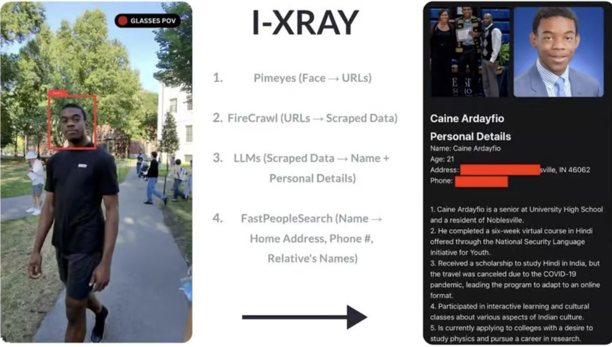 أثار الطالبان (آنفو نجوين)، و(كين أردايفيو) من جامعة هارفارد – اللذان اشتهرا بمشاريعهما المثيرة للجدل – ضجة جديدة عبر الإنترنت بمشروعهما الأخير الذي يحمل اسم (I-XRAY)، وهو عبارة عن نسخة معدلة من نظارة (Meta Ray Ban 2) الذكية، يمكنها تحديد هوية أي شخص في ثوانٍ.