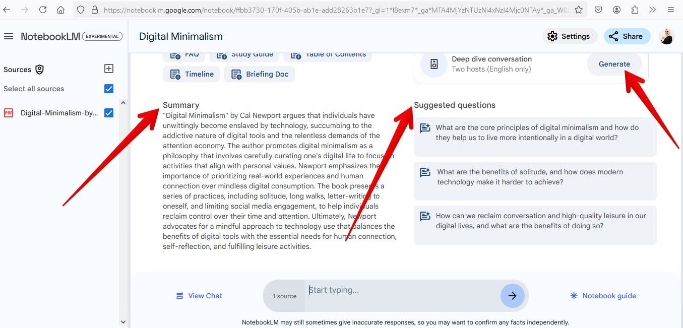 وبمجرد الانتهاء، ستحصل على ملخص للمستندات، مع أسئلة مقترحة تساعدك في فهم المعلومات بنحو أعمق، إذ يمكنك بدء محادثة مع الأداة حول المعلومات الموجودة في المستند.