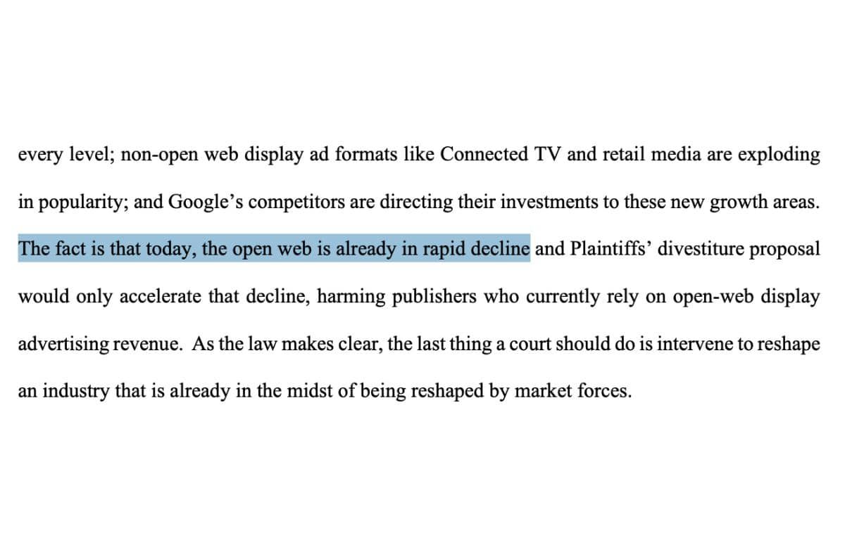وكانت وزارة العدل الأمريكية قد أوصت بتفكيك نشاط جوجل في الإعلانات لحماية المنافسة، لكن الشركة ترى أن هذا الإجراء “سوف يُسرّع تراجع الويب المفتوح”، وسوف يلحق الضرر بالناشرين الذين يعتمدون على عائدات الإعلانات.