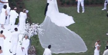 وارتدت جينيفر فستانا أبيضا رائعا، تميز بقصته الخيالية، حيث بدا مع ذيل طويل متدفق وطرحة، والجدير ذكره أن الحفل سيطر عليه اللون الأبيض حيث تم تصوير الضيوف وهم يرتدون ملابس بيضاء بالكامل في أراضي منزل “أفليك”.