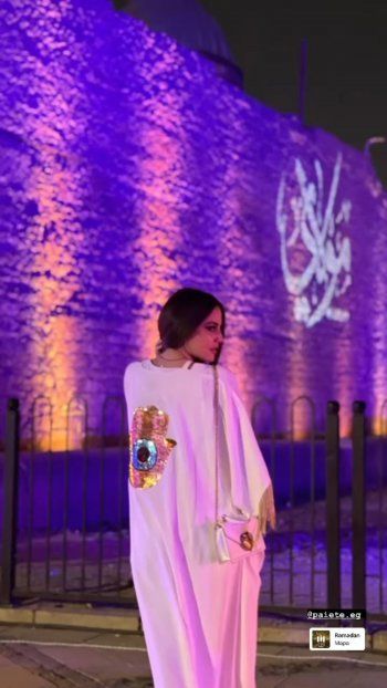 وظهرت درة بإطلالة ساحرة مرتدية عباءة باللون الأبيض، لكن اللافت بالموضوع هو شعار اليد والعين الذي يستعمل لسد الحسد، والموجود بشكل واضح عند ظهر درة.