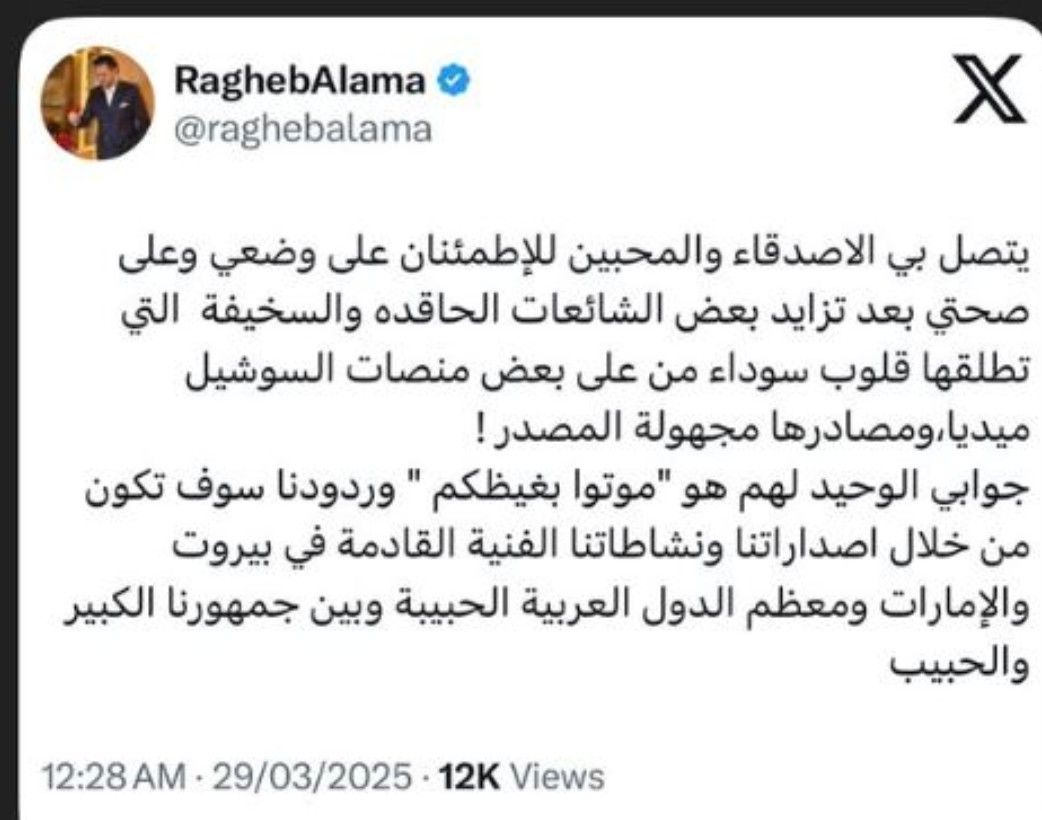 بعد انتشار شائعات التي طالت وضعه الصحي، رد الفنان راغب علامة على كل ما أثير مؤخرا، مشيراً إلى أن كل من يقوم بنشر هذه الأخبار هم أصحاب "القلوب السوداء" كما وصفهم.