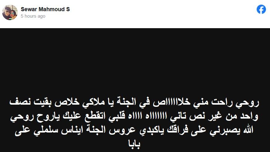 كما أكدت أنها أضحت "نصف شخص من دون نصفها الثاني"، مضيفة "اه اه قلبي اتقطع عليك ياروح روحي، الله يصبرني على فراقك ياكبدي عروس الجنة ايناس سلملي على بابا".