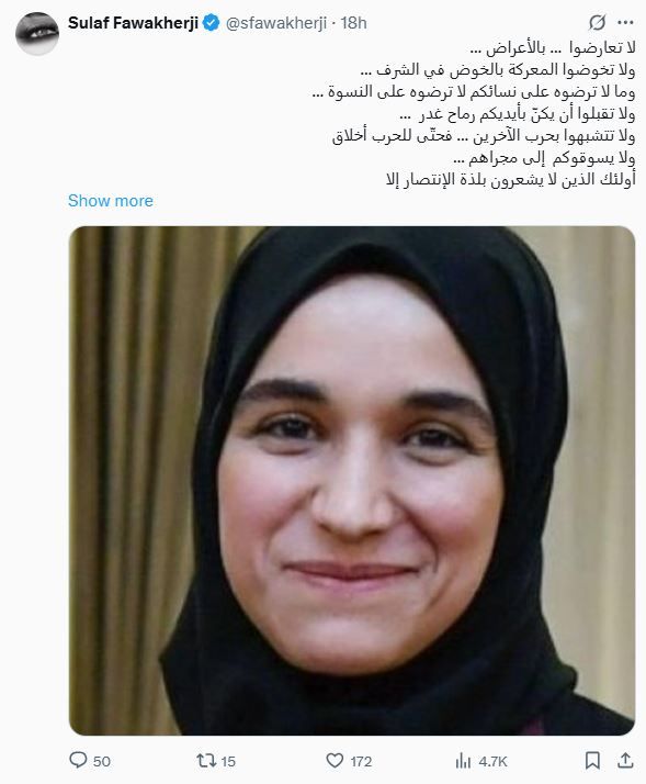 وتابعت فواخرجي : "حاربوا بشرف.. بعفة.. انتقدوا بحجة أنتم تملكونها بقوة.. وبرجولة قوتها في عطفها وتهذيبها.. وإن شتمونا.. لا تشتموهن.. ترفعوا كما كنتم.. وكما أنتم.. فصاحب الحق لا يحيد عنه والشريف لا يختم صكوك الشرف.. والمظلوم لا يَظلم.. "لا تنه عن خلق وتأتي بمثله عار عليك إذا فعلت عظيم."