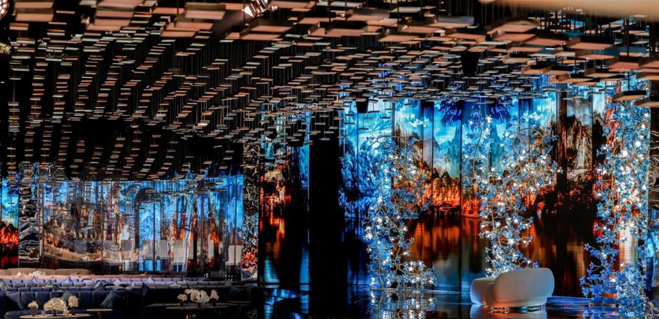وأُقيم الحفل في قاعة ذات تصميم عصري وأنيق، حيث زُيّنت السقف بعناصر هندسية معلّقة تعكس الإضاءة بشكل جذاب، بألوان مريحة للعين.