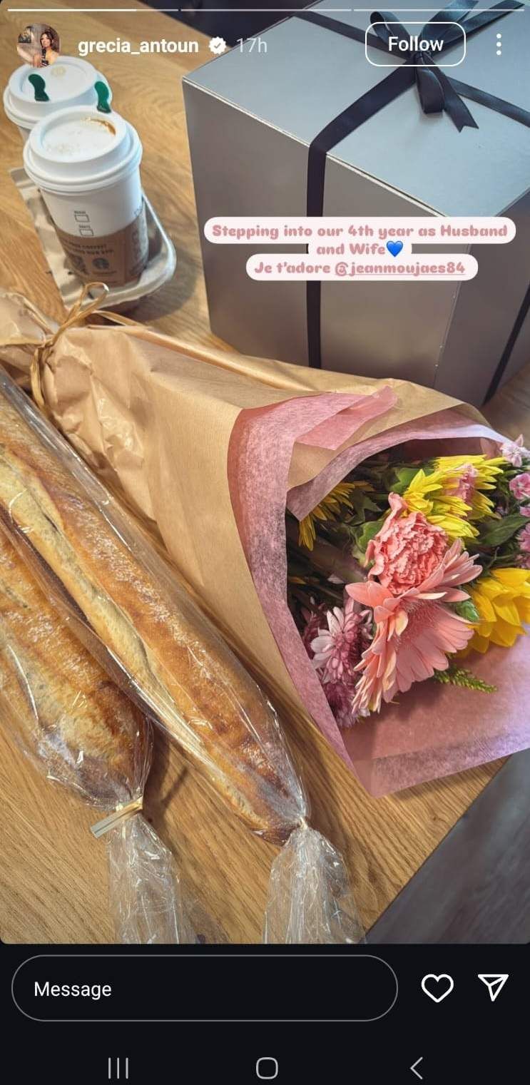 نشرت مُذيعة الأخبار في الـ"أم تي في" غريسيا أنطون، صورة عبر خاصية "ستوري" عبر حسابها على "انستغرام" لهديّة وباقة من الورد تلقتهما من زوجها جان مجاعص.