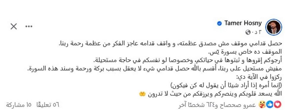 قام النجم المصري تامر حسني بنشر منشور عبر حسابه الخاص على "فيسبوك" كشف من خلاله عن تعرّضه لموقف جعله عاجزاً عن التفكير، بعد أن تمنى شيئاً وتحقق بفضل قراءته لسورة "ياسين"، حيث طلب من جمهوره تثبيت قراءة هذه السورة التي تحقق المعجزات في حياة البشر.