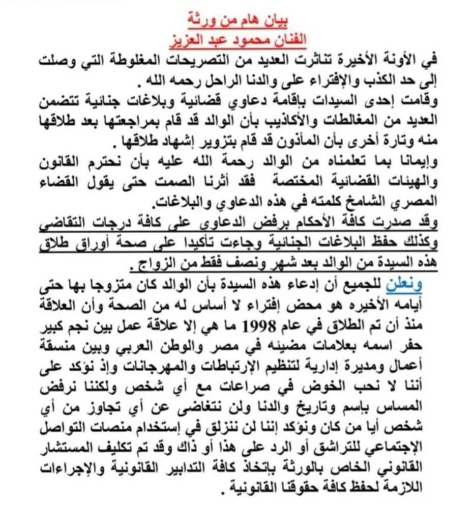 وجاء في البيان الذي نشره محمد وكريم محمود عبد العزيز عبر حساباتهم على مواقع التواصل الاجتماعي، أن "الفترة الأخيرة شهدت انتشار العديد من التصريحات الكاذبة والمضللة بشأن والدهم"، في إشارة إلى ما وصفوه بـ"افتراءات" قامت بها بوسي شلبي، حيث زعمت في بلاغات ودعاوى قضائية أن الفنان الراحل قد راجعها بعد طلاقها، بينما ادعت في مواقف أخرى أن عقد الطلاق الذي وُثّق بينهما تم تزويره من قبل مأذون شرعي".