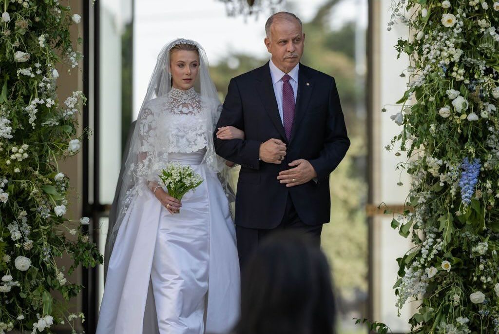 واختارت العروس فستاناً ناعماً باللون الأبيض بتصميم مجسم، وجاء مزيناً من الأعلى بالدانتيل الفخم ومن الأسفل على شكل تنورة من الساتان، وغطت شعرها بطرحة ناعمة مع تاج من اللؤلؤ.