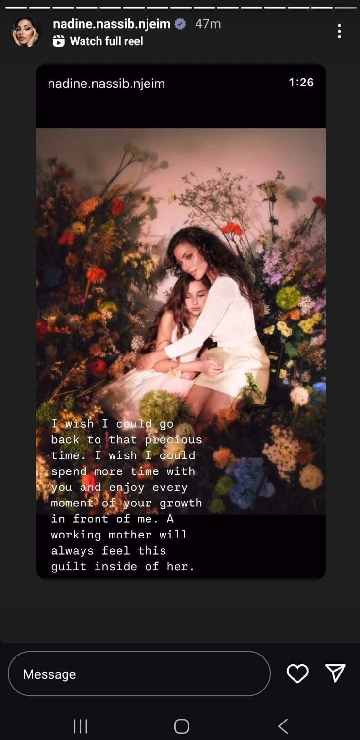 ونشرت نادين فيديو وهي برفقة طفليها عبر خاصية "ستوري"، علّقت عليه قائلة: أتمنى لو أستطيع العودة إلى هذه اللحظات الثمينة، أتمنى تمضية المزيد من الوقت برفقتكما، وأفرح في كلّ لحظة تنموان فيها أمامي".