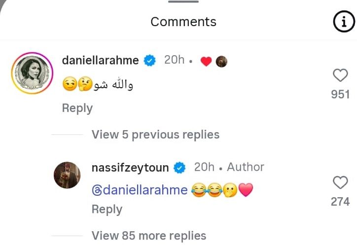 وقالت دنييلا تعليقاً على حديث زوجها في "الكليب": "والله شو"، ليردّ عليها بالضحك مع "إيموجي" لقلبٍ أحمر.
