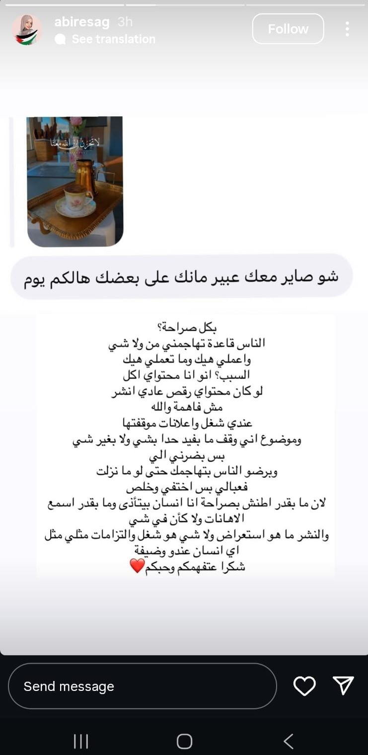 وكتبت الصغير عبر خاصية "ستوري" عبر حسابها على "انستغرام": "الناس قاعدة تهاجمني من ولا شي واعملي هيك وما تعملي هيك السبب؟ انو انا محتواي اكل لوكان محتواي رقص عادي انشر واعلانات موقفتها وموضوع اني وقف ما بفيد حدا بشي ولا بغير شي بس بضرني الي وبرضو. الناس بتهاجمك حتى لوما نزلت فعبالي بس اختفي وخلص لان ما بقدر اطنش بصراحة انا انسان بيتأذى وما بقدر اسمع الاهانات".