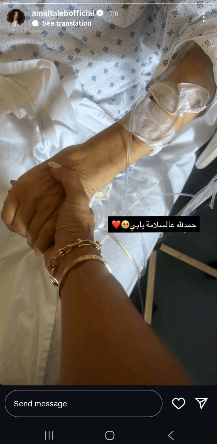 نشرت الممثلة الكوميديّة ومُقدّمة البرامج أمل طالب، صورة لوالدها من داخل المستشفى. Advertisement وفي الصورة، ظهرت طالب وهي تُمسك بيدّ والدها، وقالت: "حمدلله عالسلامة يابي".