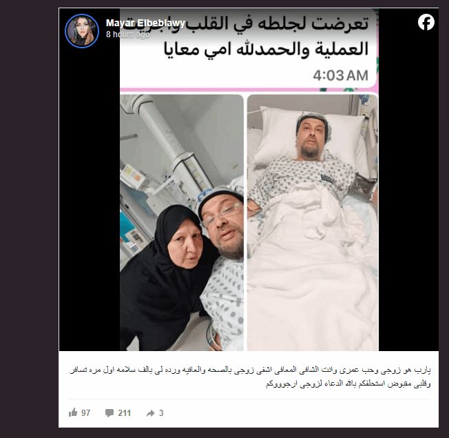 ونشرت الببلاوي عبر حسابها في فيسبوك صورة لزوجها من داخل المستشفى، بدا خلالها متصلاً بالأجهزة الطبية، مرفقة برسالة مؤثرة قالت فيها: "يارب!... هو زوجي وحب عمري، وأنت الشافي المعافي، اشفِ زوجي بالصحة والعافية، ورده لي بألف سلامة. أستحلفكم بالله الدعاء له… أرجوكم".