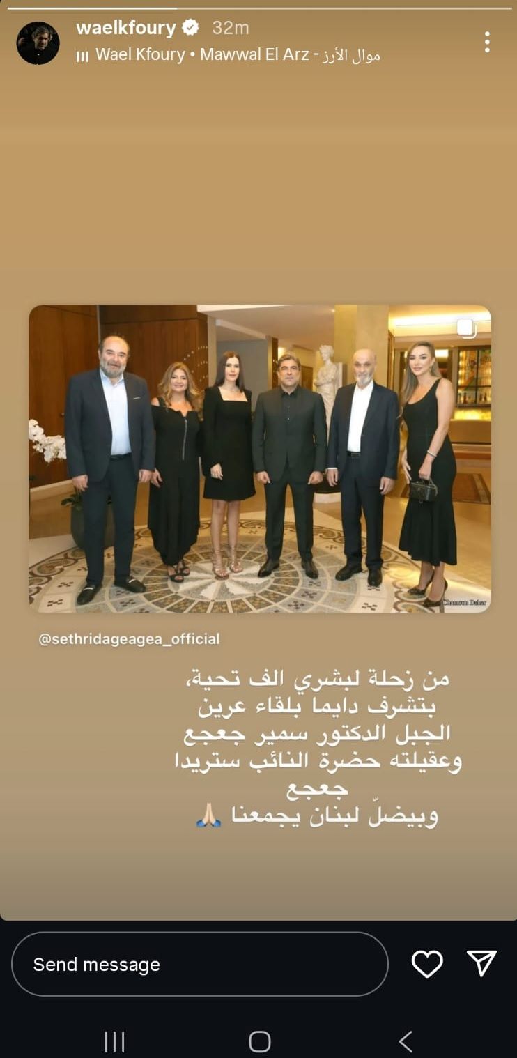 علّق الفنان وائل كفوري على لقائه وزوجته شانا عبود برئيس حزب "القوّات اللبنانيّة" سمير جعجع وعقيلته النائبة ستريدا جعجع.