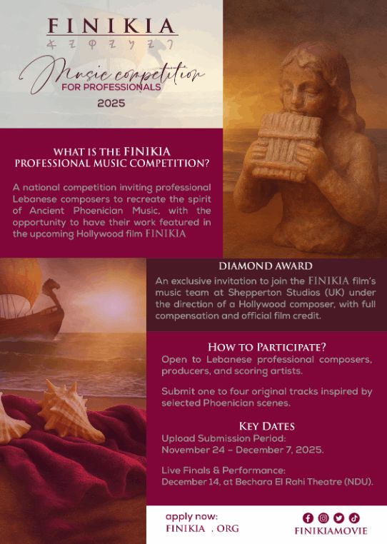 أعلنت اللجنة التحضيرية لفيلم “FINIKIA” عن إطلاق مسابقة جديدة مخصصة للموسيقيين المحترفين، بعد أسبوع تقريبًا على إطلاق مسابقة الناشئين. تهدف المسابقة إلى ابتكار مقطوعة موسيقية مستوحاة من الحضارة الفينيقية، لتصبح نواة الموسيقى التصويرية للفيلم، الذي سيُنتَج بالتعاون مع هوليوود على الشاطئ اللبناني.