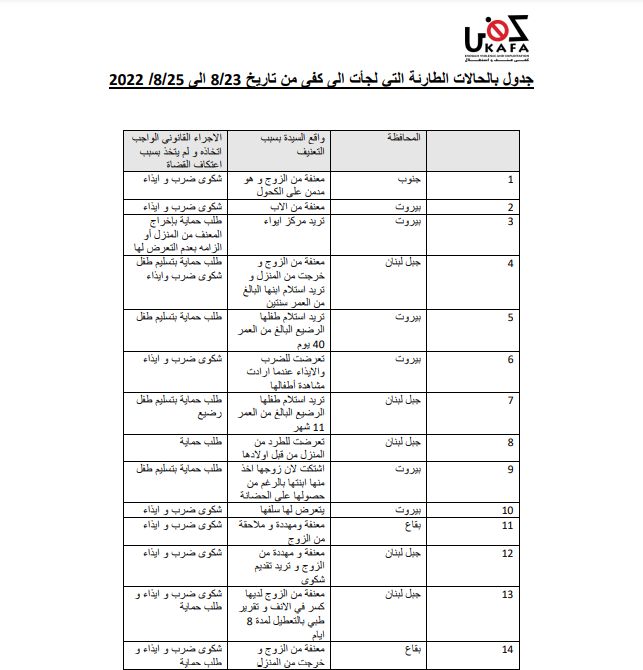 ليست لمى بأفضل حال من كثيرات غيرها، فإحداهن يجري تعنيفها بقوة من قبل زوجها في كل مرة لا تأتي بالمال بعد "التسول"، وتلك التي حُرمت من ابنها الرضيع البالغ من العمر 11 شهراً، وسمر التي كُسر انفها جراء الضرب المتكرر وحياتها مهددة بالموت يوميا، وغيرهن ممن لم يتم اتخاذ أي إجراء قانوني يحميهن بسبب اعتكاف القضاة عن العمل، وهذه الحالات جميعها مرصودة بجدول بالحالات الطارئة التي لجأت الى جميعة "كفى عنف" خلال فترة اعتكاف القضاة.