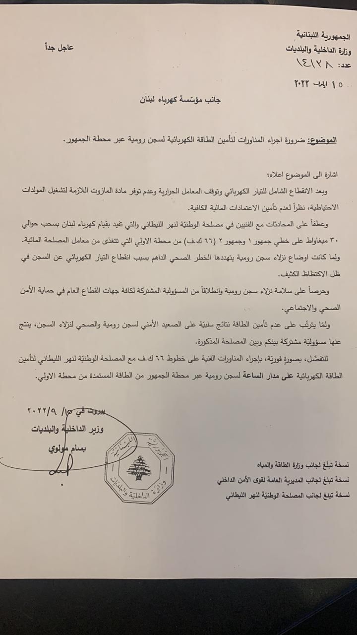 وجّهت وزارة الداخلية لمؤسسة "كهرباء لبنان" كتاباً، حول ضرورة إجراء المناورات لتأمين الطاقة الكهربائيّة لسجن روميّة، عبر محطة الجمهور. التفاصيل في الصورة المرفقة أدناه: