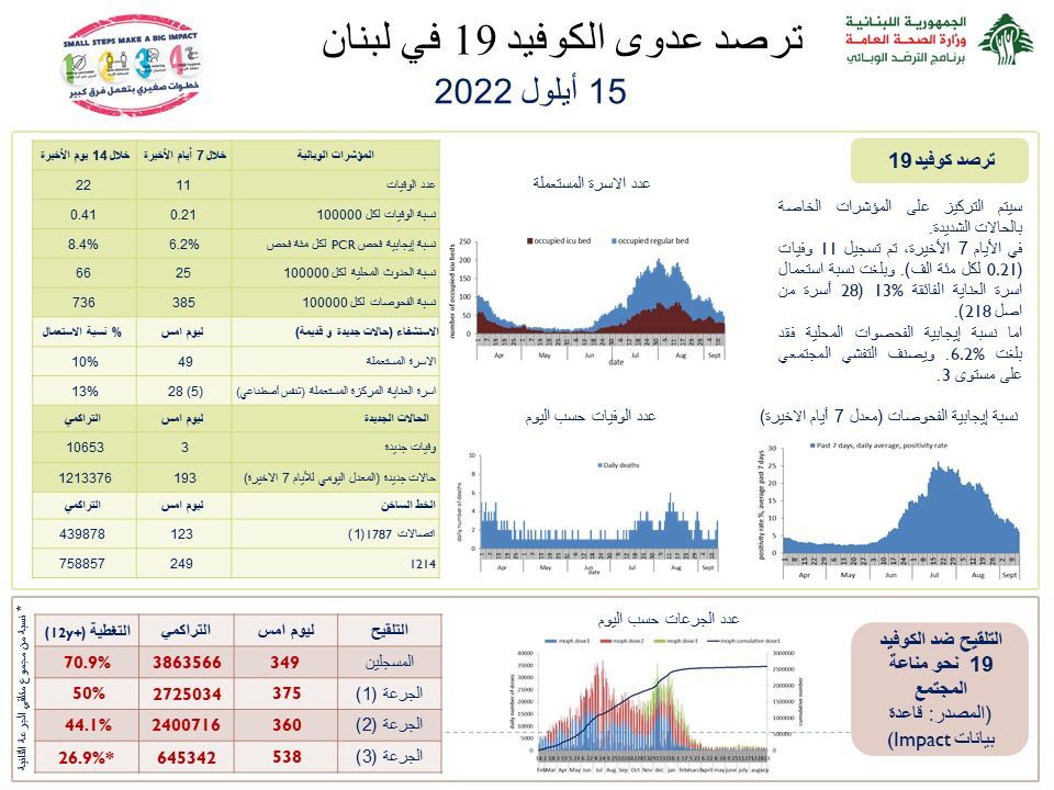 أعلنت وزارة الصحة العامة عن تسجيل 193 إصابة جديدة بفيروس كورونا ليرتفع العدد التراكمي للإصابات منذ بدء انتشار الوباء إلى 1213376. كما وسجل لبنان ثلاث حالات وفاة ما رفع العدد التراكمي للوفيات إلى 10653.