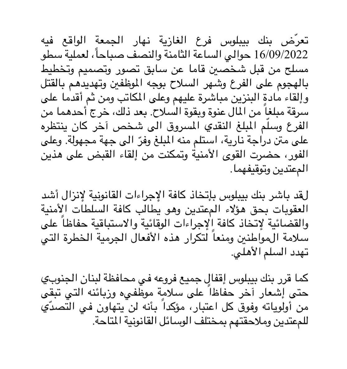 أعلن "بنك بيبلوس" في بيان، أنّه قرّر إقفال فروعه في محافظة لبنان الجنوبيّ حتّى إشعارٍ آخر، حفاظاً على سلامة موظّفيه وزبائنه.