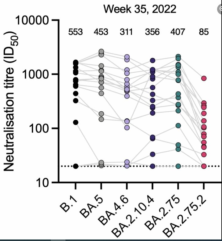 وفي هذا الإطار، نشر الدكتور والباحث العلمي في فيزياء وتكنولوجيا النانو وسيم جابر رسماً بيانياً يُظهر "كيف يؤدي متحوّر BA.2.75.2 الى هروب شديد للأجسام المضادة أكثر من أي متحوّر رأيناه حتى الآن"، وبالتالي سرعة العدوى وفعالية الانتشار للمتحور الجديد.