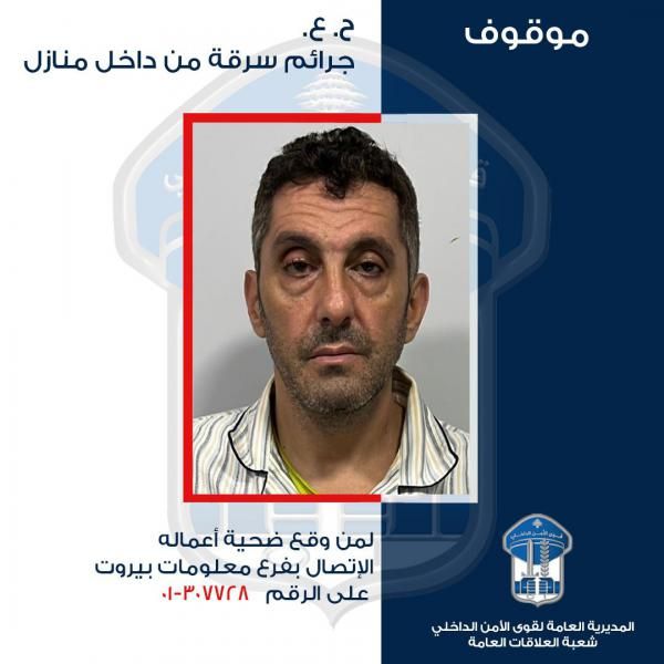 "إلحاقا لبلاغنا الصادر بتاريخ 23-09-2022، حول تمكّن شعبة المعلومات في قوى الأمن الداخلي من كشف هوية وتوقيف منفّذ عدد من سرقات المنازل ضمن مدينة بيروت الذي يستغل طبيعة عمله كسمكري، ويدعى: ح. ع. (من مواليد عام ١٩٧٢، لبناني) الملقب بـ “الشيخ".