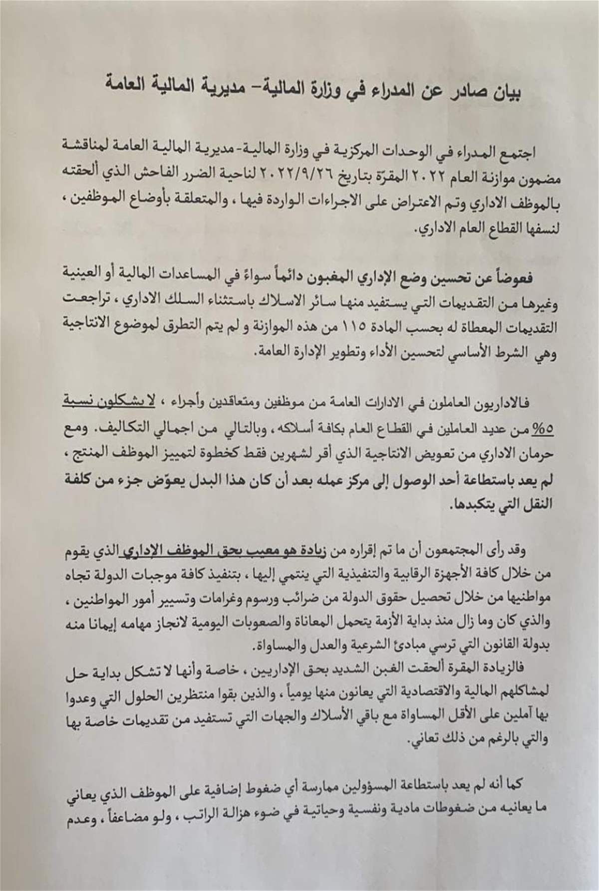 وفي ما يلي نصّ البيان الصادر عن المُدراء في "الماليّة":