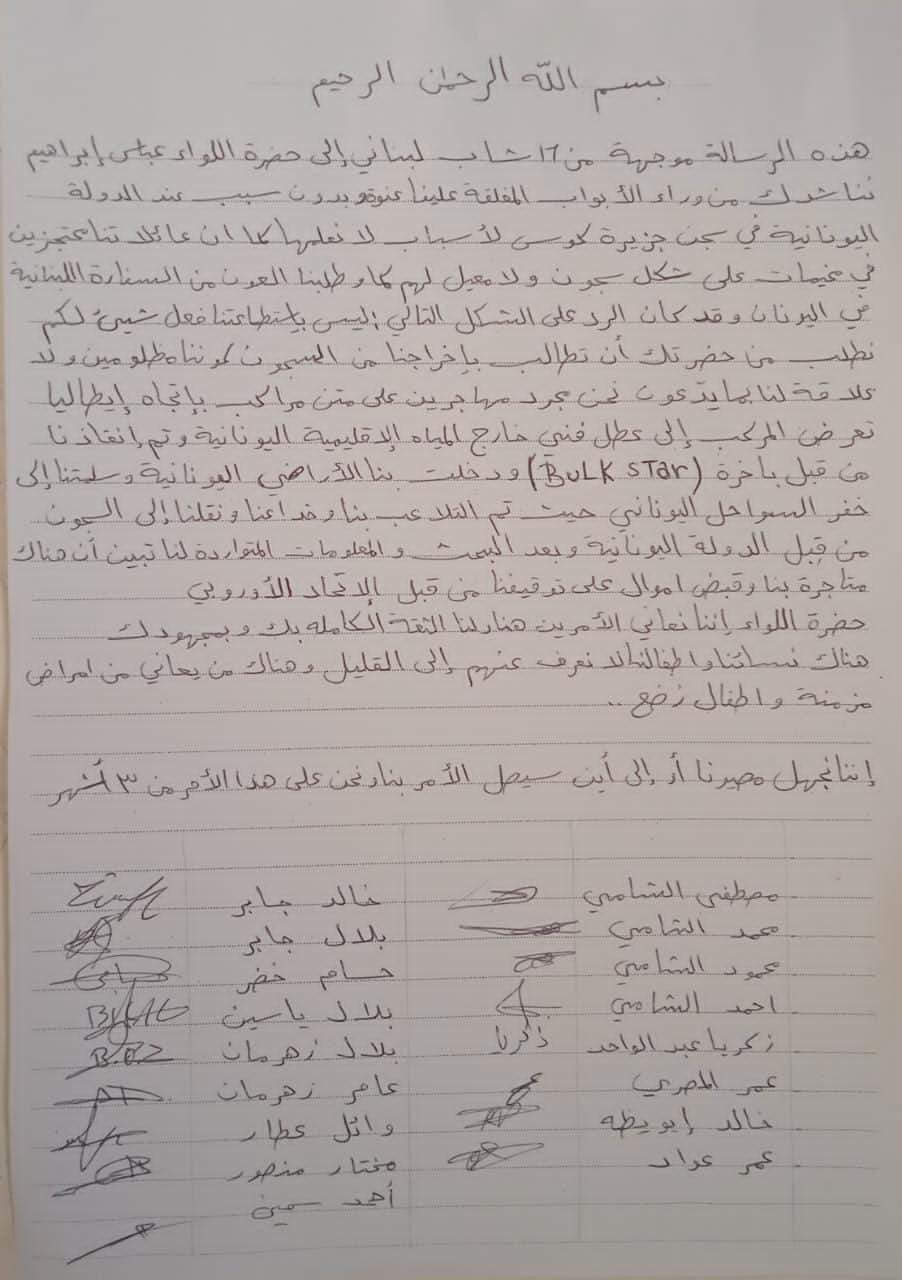 وبحسب الرسالة، فإنّ العطل حصل خارج المياه الإقليمية اليونانية، وقد تم إنقاذ أفراد المركب من قبل باخرة "بالك ستار" التي دخلت بهم إلى الأراضي اليونانية وسلمّتهم إلى خفر السواحل اليوناني، حتى جرى وضعهم في سجنٍ ضمن جزيرة "كوس" اليونانية.