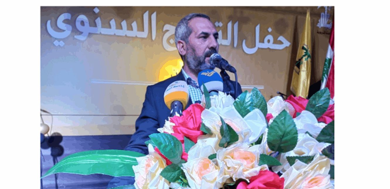 كلام حمادة جاء خلال رعايته حفل التخرج السنوي ل102 من طلاب الشهادات الرسمية الذي نظمته التعبئة التربوية ل"حزب الله" في منطقة صيدا داخل باحة مجمع الامام الحسين في عنقون، في حضور رئيس البلدية جعفر فرحات، مسؤول منطقة صيدا في الحزب الشيخ زيد ضاهر وفاعليات حزبية وتربوية واجتماعية واختيارية وأهلية وعلماء وشخصيات من البلدة.