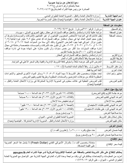 كتب وزير الاشغال العامة والنقل في حكومة تصريف الاعمال علي حمية عبر منصة "اكس": "ضمن الاسثمار الأمثل للمرافق التابعة لمطار رفيق الحريري الدولي - بيروت، ينتظر في الشهر الجاري فض العروض للمزايدة العمومية لتلزيم استثمار وتشغيل مواقف السيارات في المطار ، وهي مفتوحة لكل من تتوفر فيه الشروط للتقدم إليها وفقا لاحكام قانون الشراء العام".