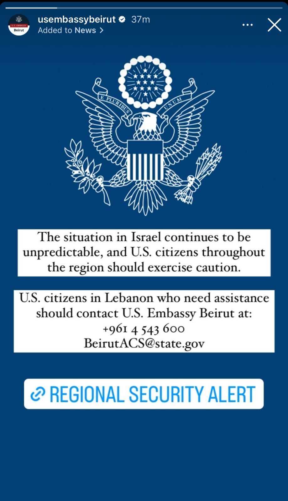 طالبت السفارة الأميركية في بيروت عبر منصة "أكس" من المواطنين الأميركيين في المنطقة توخّي الحذر، معتبرة ان الوضع في إسرائيل لا يزال غير قابل للتنبّؤ.