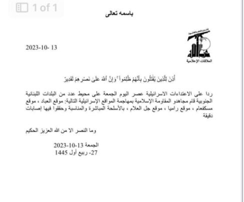 أعلنت المقاومة الاسلامية في بيان استهداف مواقع العباد، مسكاف عام، رامية، جل العلم بالاسلحة المباشرة والمناسبة وتحقيق اصابات دقيقة.
