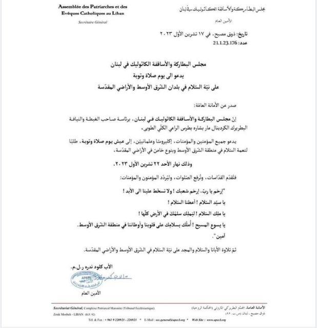 دعا مجلس البطاركة والاساقفة الكاثوليك في لبنان، برئاسة البطريرك الكاردينال مار بشارة بطرس الراعي، الى "عيش يوم صلاة وتوبة" من اجل السلام في الشرق الاوسط والأراضي المقدّسة، وذلك نهار الاحد المقبل.