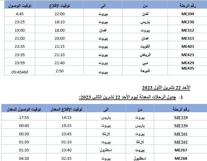 أعلنت شركة طيران الشرق الأوسط – الخطوط الجوية اللبنانية في بيان، أنه "بسبب الظروف التي تمرّ بها المنطقة، ونتيجة تخفيض الغطاء التأميني ضد مخاطر الحرب على الطيران في لبنان، وبما أن شركة طيران الشرق الأوسط تسعى دائماً الى إبقاء جسر التواصل بين لبنان والخارج، فقد عمدت الشركة الى تخفيض عدد رحلاتها وإعادة جدولتها إبتداءً من فجر يوم الأحد الواقع فيه 22 تشرين الأول 2023".