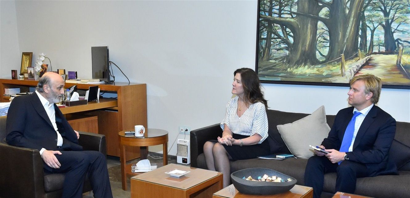 عرض رئيس حزب "القوات اللبنانية" سمير جعجع، في المقر العام للحزب في معراب، مع سفيرة الولايات المتحدة الأميركية دورثي شيا التطورات في لبنان والمنطقة، في حضور المستشار في السفارة براين بارون، رئيس جهاز العلاقات الخارجية الوزير السابق ريشار قيومجيان والدكتور جوزف جبيلي.