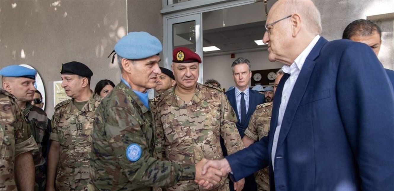 وكان الرئيس ميقاتي قام بجولته الجنوبية المفاجئة التي شملت القيادة العسكرية للجيش في المنطقة كما قيادة "اليونيفيل" امس معلنا "ان الجيش هو ركن البنيان الوطني واليه تشخص العيون اليوم في الداخل والخارج" وأشار الى "اننا اتينا الى جنوبنا الحبيب، الذي يدفع اليوم، كما دفع دوماً، ضريبة دفاعه عن كامل اراضي الوطن بوجه كيانٍ غاصب لا يعرف الرحمة، لنؤكد احترام لبنان، هذا البلد المحب للسلام، لكافة قرارات الشرعيّة الدوليّة، والإلتزام بتطبيق قرار مجلس الأمن الدّولي الرقم 1701". وشدد على"أن منطق القوة في وجه الحق المتبع اليوم لا يستقيم كل الاوقات، والمطلوب العودة الى منطق قوة الحق وفق ميثاق الامم المتحدة وشرعة حقوق الانسان". وكان رئيس الحكومة تفقد بمشاركة قائد الجيش العماد جوزف عون، منطقة القطاع الغربي في جنوب لبنان للاطلاع على الاوضاع هناك والمهام التي يقوم بها الجيش بالتعاون مع قوات "اليونيفيل".