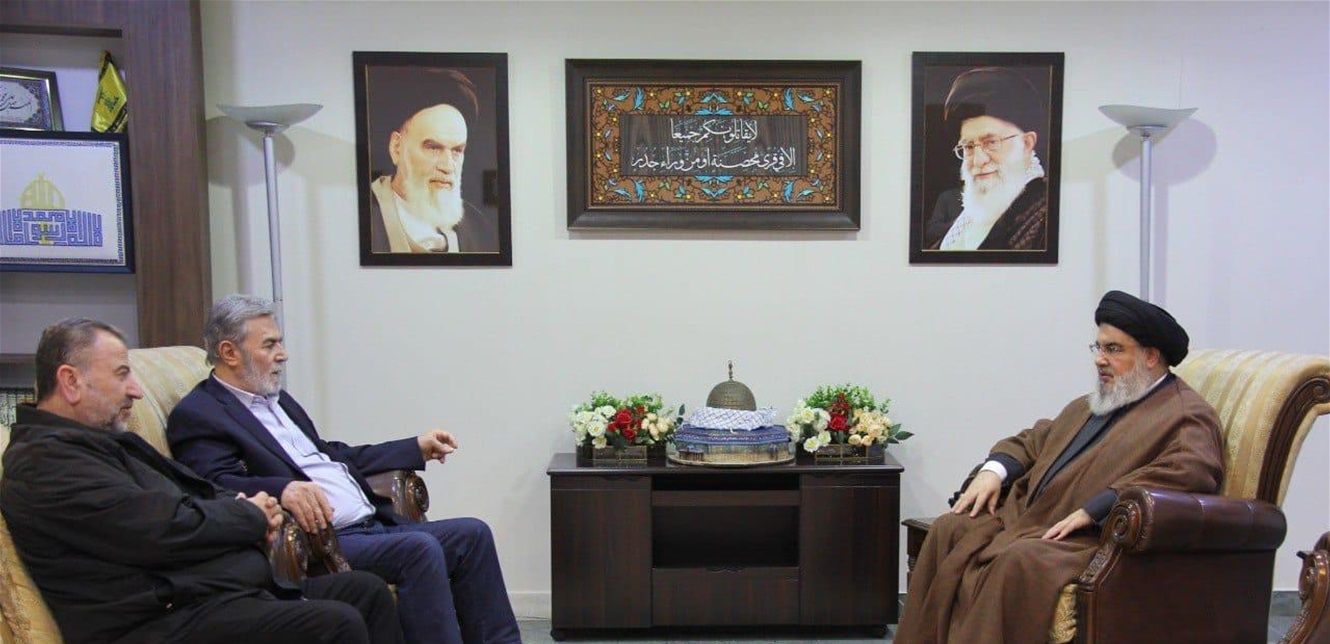 استقبل الأمين العام لحزب الله سماحة السيد حسن نصرالله الأمين العام لحركة الجهاد الإسلامي في فلسطين زياد نخالة ونائب رئيس المكتب السياسي لحركة حماس الشيخ صالح العاروري، حيث جرى استعراض الأحداث الأخيرة في قطاع غزة منذ بدء عملية طوفان الأقصى وما تلاها من تطورات على كل صعيد، وكذلك المواجهات القائمة عند الحدود اللبنانية مع فلسطين المحتلة، وجرى تقييم للمواقف المتخذة دوليًا وإقليميًا "وما يجب على أطراف محور المقاومة القيام به في هذه المرحلة الحساسة لتحقيق انتصار حقيقي للمقاومة في غزة وفلسطين ووقف العدوان الغادر والوحشي على شعبنا المظلوم والصامد في غزة وفي الضفة الغربية، وتمّ الاتفاق على مواصلة التنسيق والمتابعة الدائمة للتطورات بشكل يومي ودائم"، بحسب بيان صادر عن حزب الله.