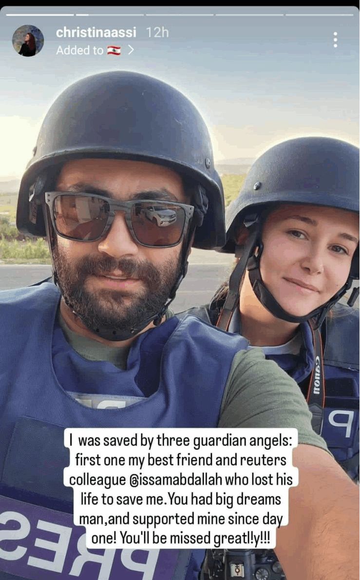 نشرت الصحافية كريستينا عاصي، التي تعرّضت لإصابة بليغة أثناء تغطية الاحداث الامنية في الجنوب إثر قصف إسرائيلي استهدف السيارة التي كانت تتواجد فيها برفقة عدد من الصحافيين بينهم الشهيد عصام عبدالله، صورة لها ولعبدالله على خاصية الستوري، قالت فيها إن عبدالله أنقذ حياتها من الموت، وفقد حياته من أجل إنقاذها.