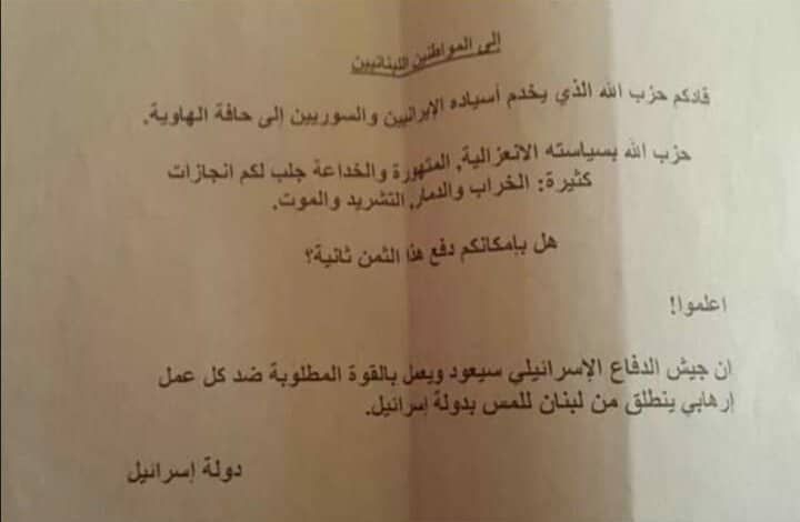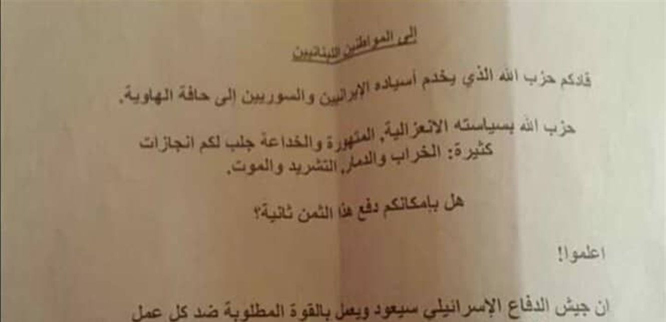 تناقل ناشطون عبر مواقع التواصل الإجتماعي صورةً لمنشورٍ قيل أنّ جيش العدو الإسرائيلي ألقاهُ، اليوم الثلاثاء، فوق مدينة صيدا عبر طائرة تجسسية.