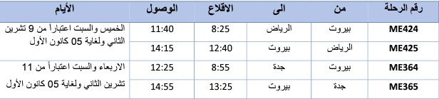 أعلنت شركة طيران الشرق الأوسط - الخطوط الجوية اللبنانية، في بيان، " تسيير رحلات اضافية صباحية (بالاضافة الى الرحلات المسائية القائمة حالياً) الى كل من مدينة الرياض وجدة في المملكة العربية السعودية وفقاً للجدول التالي: