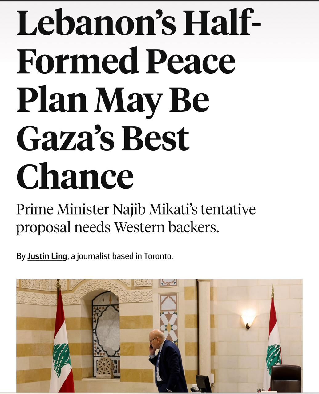 وبحسب مجلة "Foreign Policy" الأميركية، "لقد حان الوقت لكي يتدخل القادة الغربيون. ومع ارتفاع عدد القتلى في غزة، الذي تجاوز حتى الآن 10 آلاف شخص، يحاول ميقاتي الحصول على دعم الحلفاء لخطة السلام المكونة من ثلاث خطوات، والتي تأتي على الشكل التالي: أولاً، يقترح ميقاتي أن يتم وقف الأعمال العدائية لمدة خمسة أيام، حيث تقوم حماس بإطلاق سراح بعض الرهائن الإسرائيليين، وتفتح إسرائيل معابرها الحدودية أمام المزيد من المساعدات الإنسانية. وإذا لم يتم خرق هذا الوقف لمدة 120 ساعة، فسوف تبدأ المفاوضات من أجل إطلاق سراح الرهائن المتبقين في مقابل إطلاق سراح السجناء الذين تحتجزهم إسرائيل. وعندما يتم هذا الامر، يبدأ العمل على عقد قمة دولية لحل الدولتين بشكل دائم".