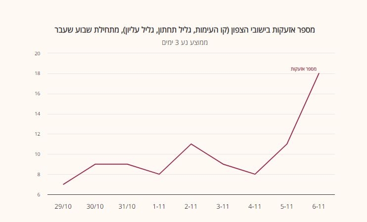 وأظهر الموقع رسماً بيانياً كشف عن كيفية تطور عدد هجمات الحزب ضد المستوطنات الإسرائيلية خلال الأيام القليلة الماضية، وما بدا هو أن تلك العمليات اتخذت منحى تصاعدياً اعتباراً من يوم الـ6 من تشرين الثاني الجاري.