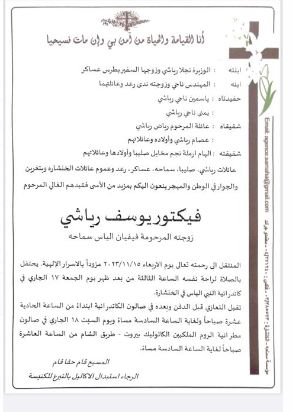 توفي السيد فيكتور رياشي، والد وزيرة التنمية الادارية نجلا رياشي. ويحتفل بالصلاة لراحة نفسه غدا الجمعة في كاتدرائية النبي الياس في الخنشارة.