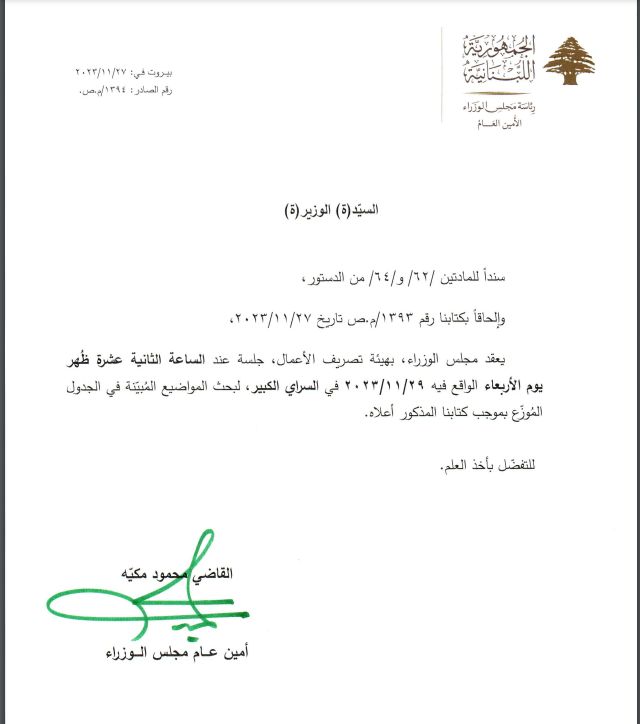 يعقد مجلس الوزراء جلسة عند الثانية عشرة ظهر الاربعاء المقبل لبحث جدول الاعمال الموزع على الوزراء للاطلاع سابقا. للاطلاع على جدول الاعمال، يمكن الضغط هنا: