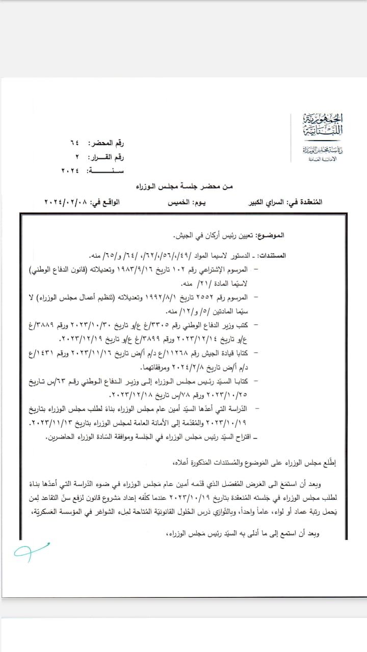 صدر عن مجلس الوزراء قرار تعيين رئيس الأركان في الجيش حسان عودة. التفاصيل في الصور المرفقة أدناه:
