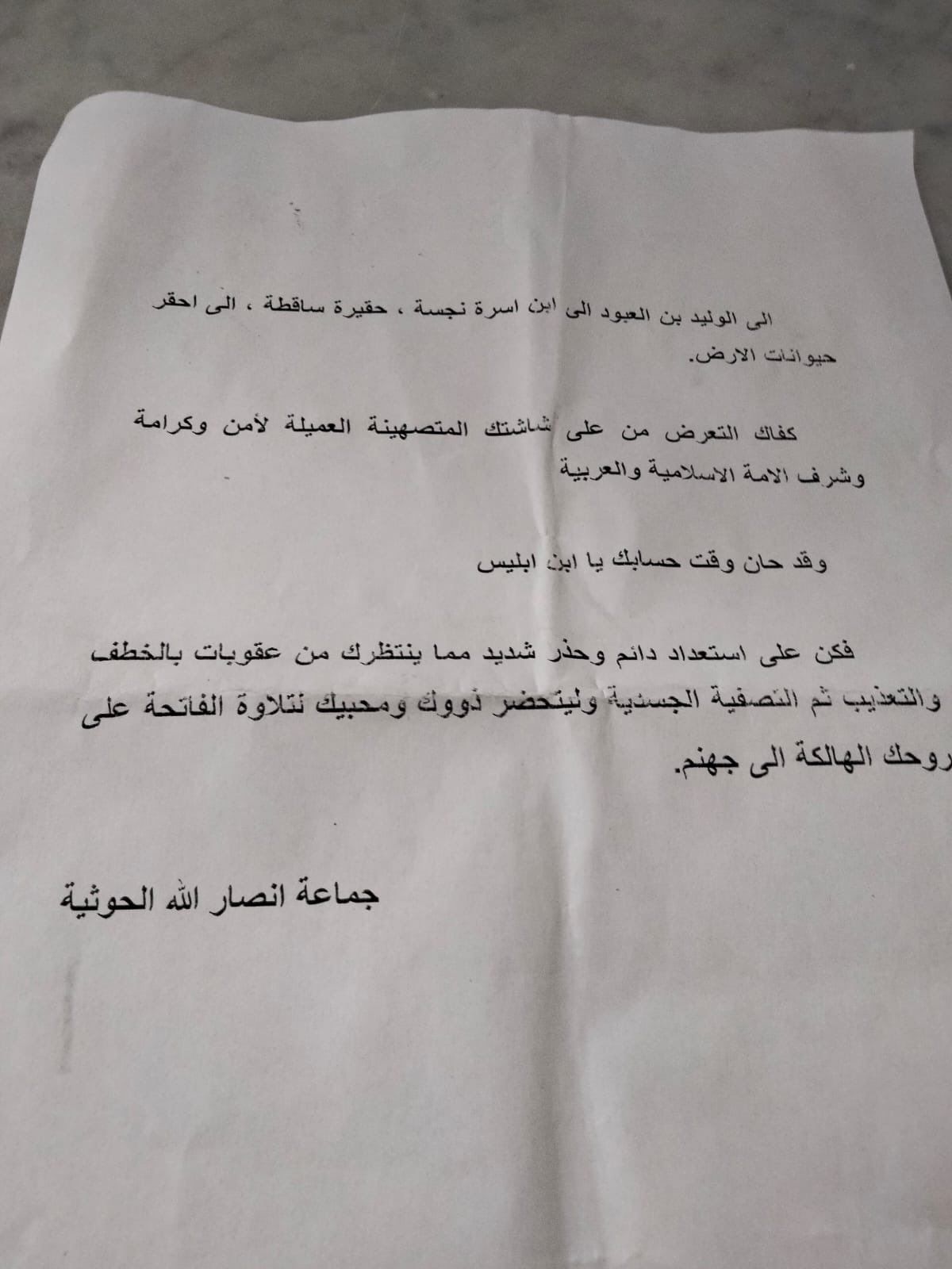تعرض الإعلامي وليد عبود لتهديد بالقتل بعدما وجد ورقة على سيارته تحت منزله موقعة من جماعة أنصار الله “الحوثيين”. وجاء في نص التهديد: