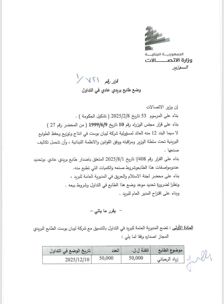 أصدر وزير الاتصالات شارل الحاج، قراراً بوضع طابع بريدي جديد يحمل صورة زياد الرحباني في التداول، فئة 50 ألف ليرة وبعدد 50 ألف نسخة، ابتداءً من 10 كانون الأول 2025.