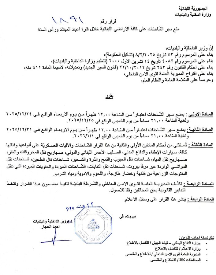 أصدر وزير الداخلية والبلديات أحمد الحجار، اليوم الإثنين، قرارًا حول منع سير الشاحنات على الأراضي اللبنانية كافة خلال فترة أعياد الميلاد ورأس السنة. تجدون التفاصيل مرفقة: